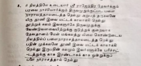 c. From the grains received from these lands, Rajadhiraja orders to arrange for ‘thiruvamudhu’ and ‘parisattam’ to be offered to the icons of Rajendra Chola I and Anukkiyar Paravai Nangaiyar. ‘Thiruvamudhu’ is the ‘holy food offered to deities in temples’ and ‘Parisattam’ denotes the clothes to be offered.